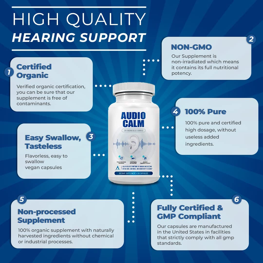 Audio Calm is a totally safe and completely natural solution that provides you with soothing relief using a scientifically necessary combination of ingredients that calm the entire nervous system and quick-dry anxiety attacks. Not only can it help you calm your mind, but it also helps lower the risk of memory disorders, help improve your memory, help you increase your speed of thought and concentration, and help improve your hearing.