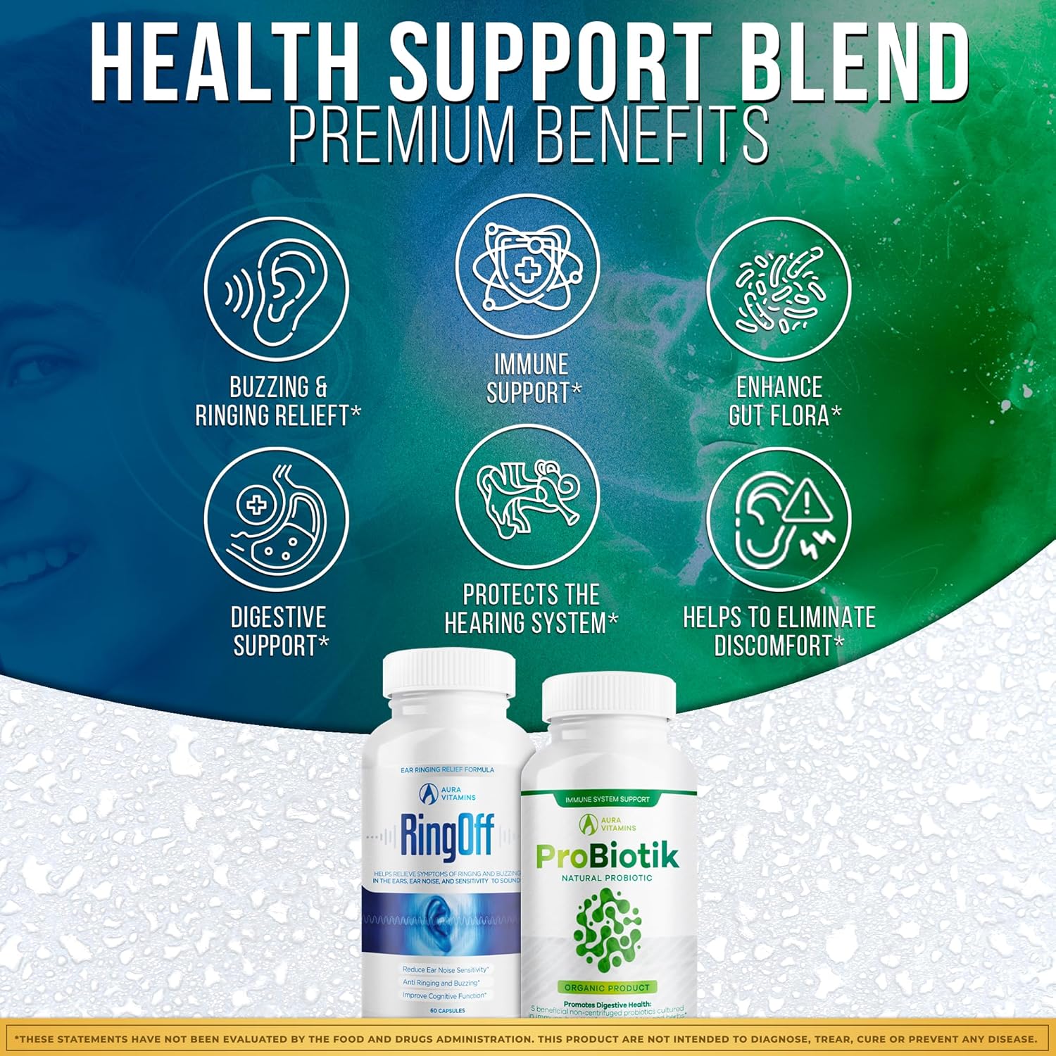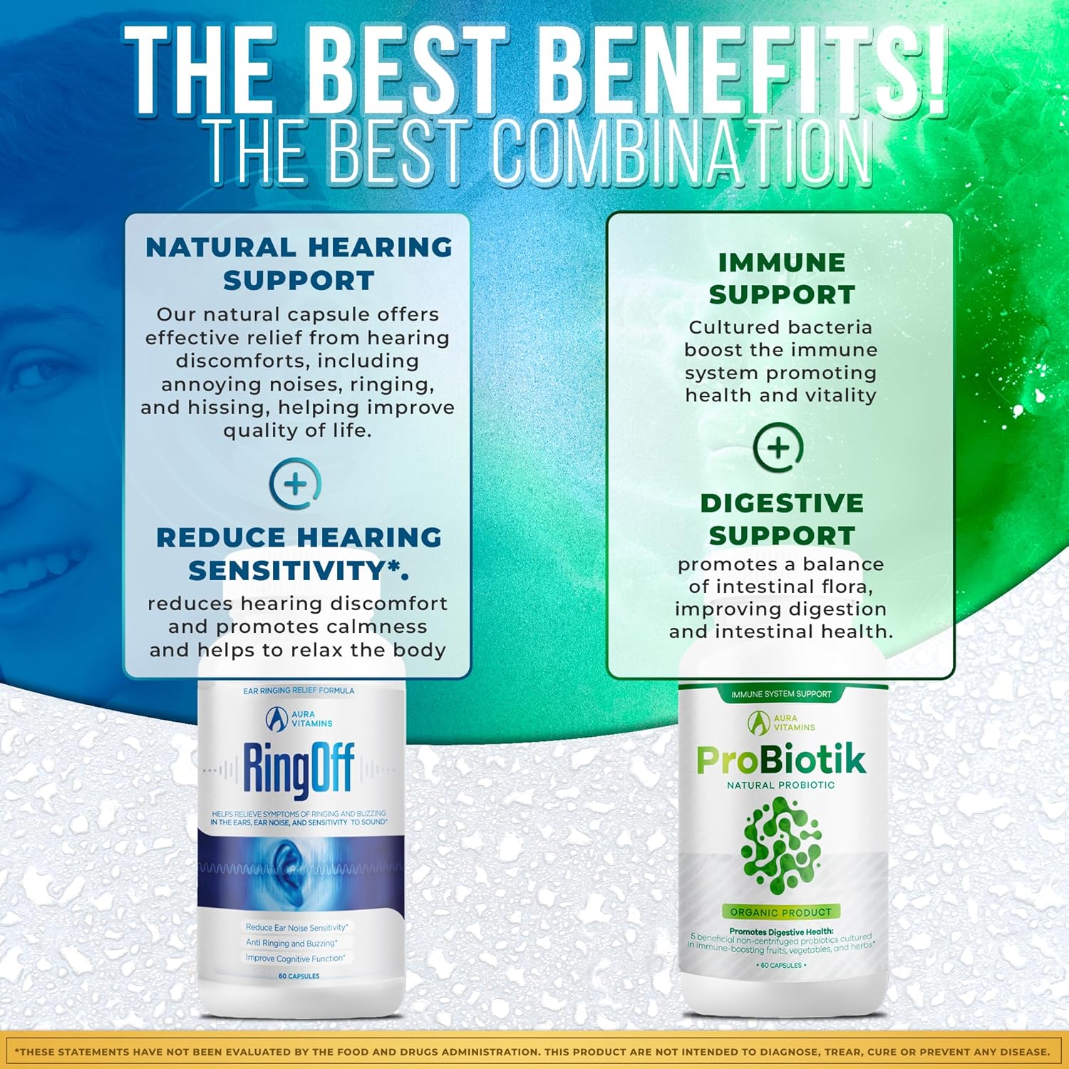 The Ring Off Tinnitus Relief & Probiotik Culturelle Probiotic Bundle offers dual support for ear health and digestive wellness. The Ring Off formula reduces tinnitus symptoms like buzzing and ringing, while Probiotik Culturelle promotes digestive balance, reduces bloating, and supports regularity. Made with natural, safe ingredients, this convenient bundle supports both hearing and gut health, providing a holistic approach to overall well-being.