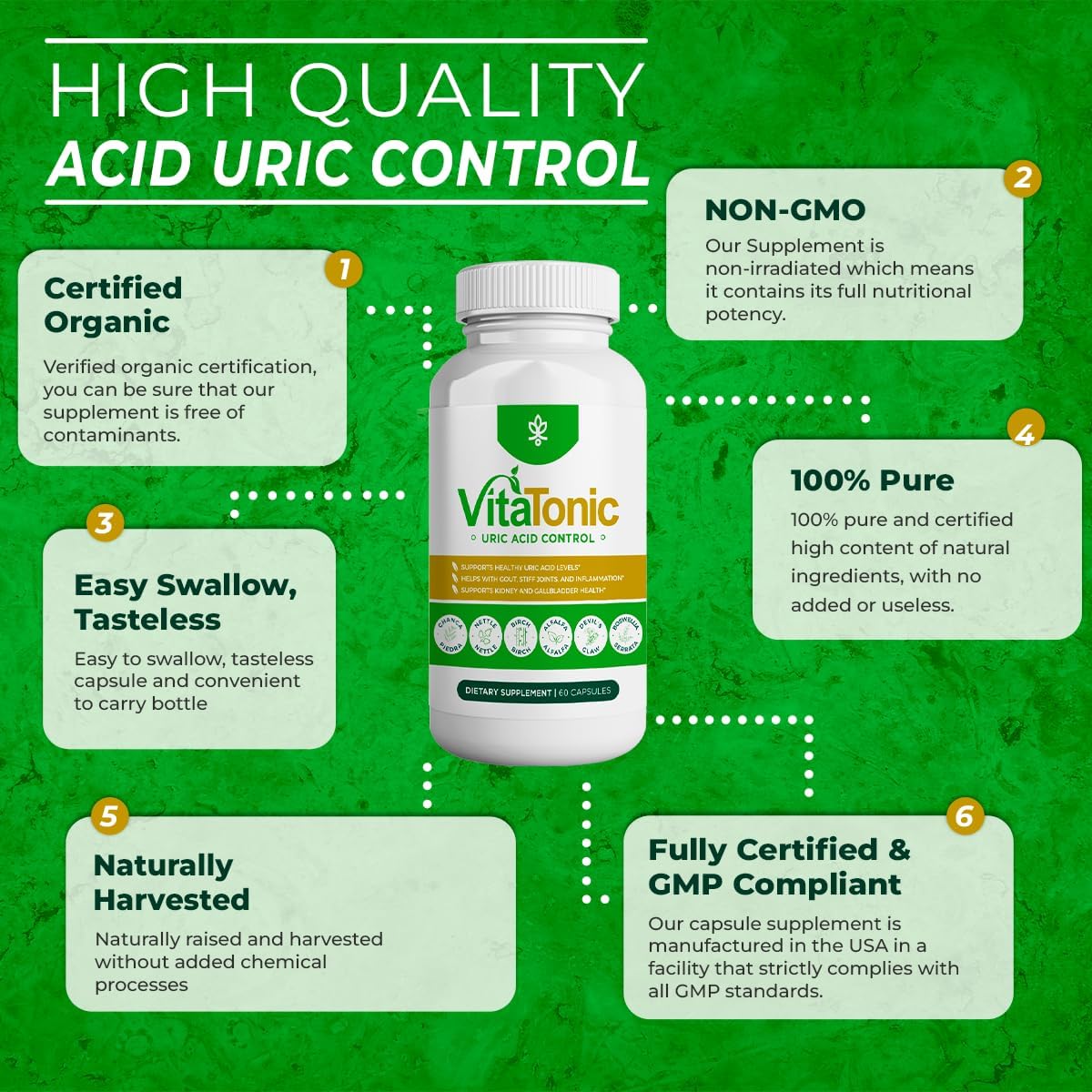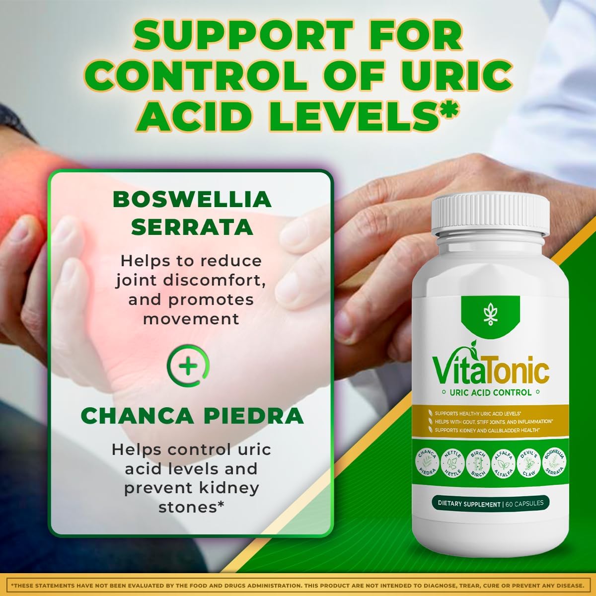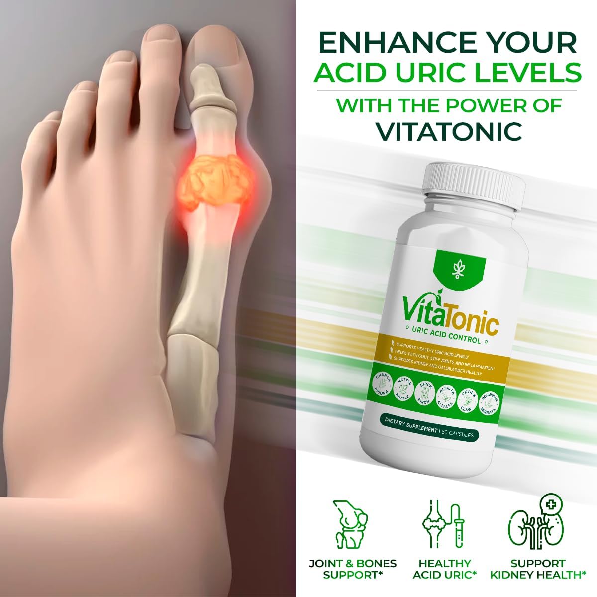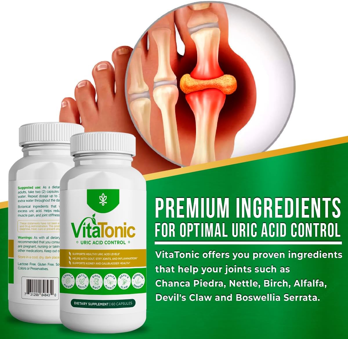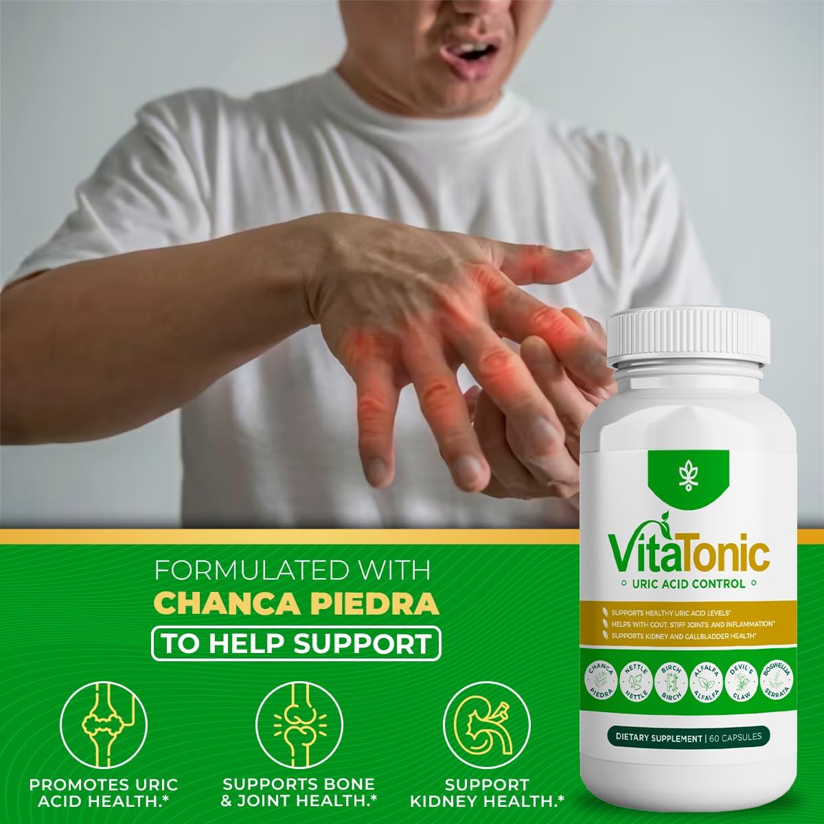 VitaTonic features a specialized blend of botanical ingredients designed to eliminate excess uric acid and improve uric acid health in both men and women. By helping the body eliminate excess uric acid crystals, this formula aids in reducing gout flare-ups, muscle pain, and joint stiffness.